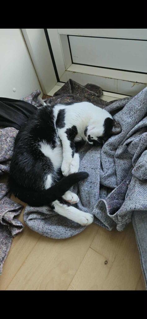 Efter en lang dag ude elsker han at komme ind og putte – gerne helt tæt, og han søger ofte opmærksomhed ved at ligge på brystet.