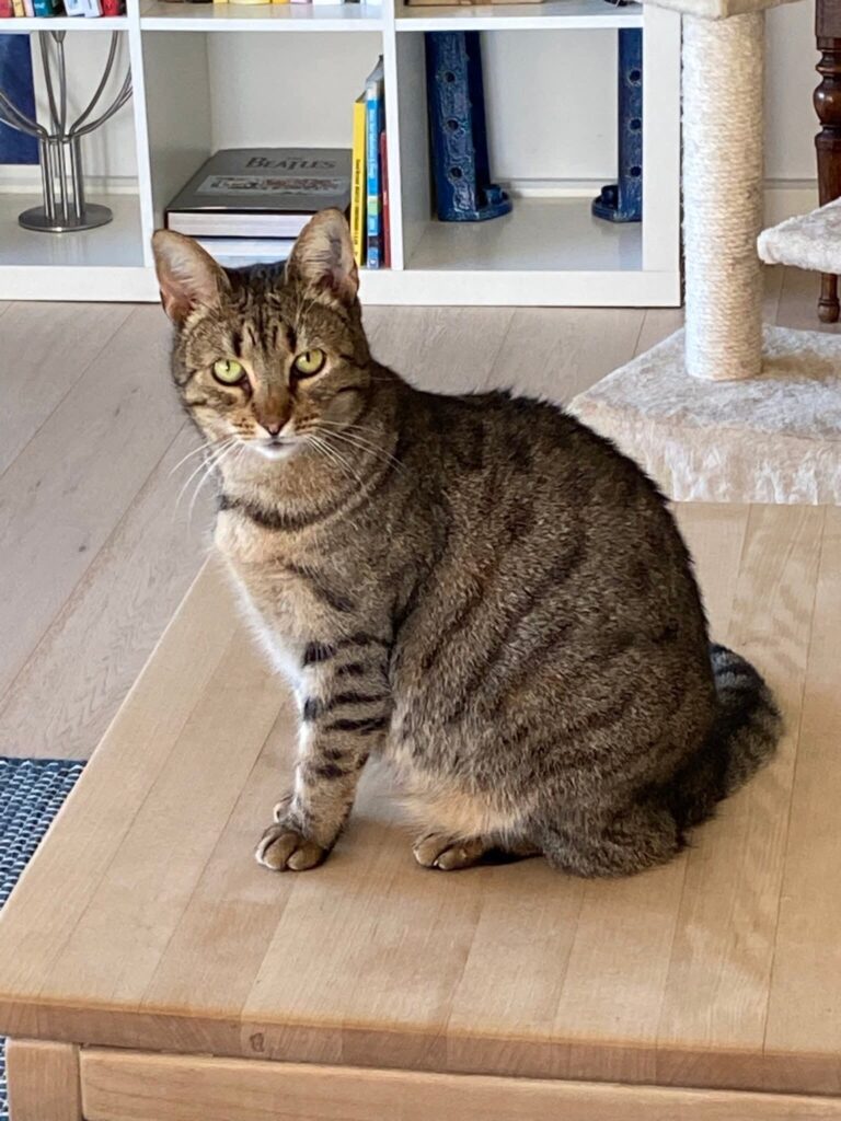 Sfinksen: er en lille fin, smuk, gråbrun og meget rolig hunkat på ca. 5 år, som vil trives fint som alenekat. Hun er meget social overfor mennesker og opsøger os og følger os rundt i huset. Hun er ikke glad for berøring men er ellers meget tryg ved mennesker – også gæster. Hun elsker at komme lidt ud og drikke vand af fuglebadet.